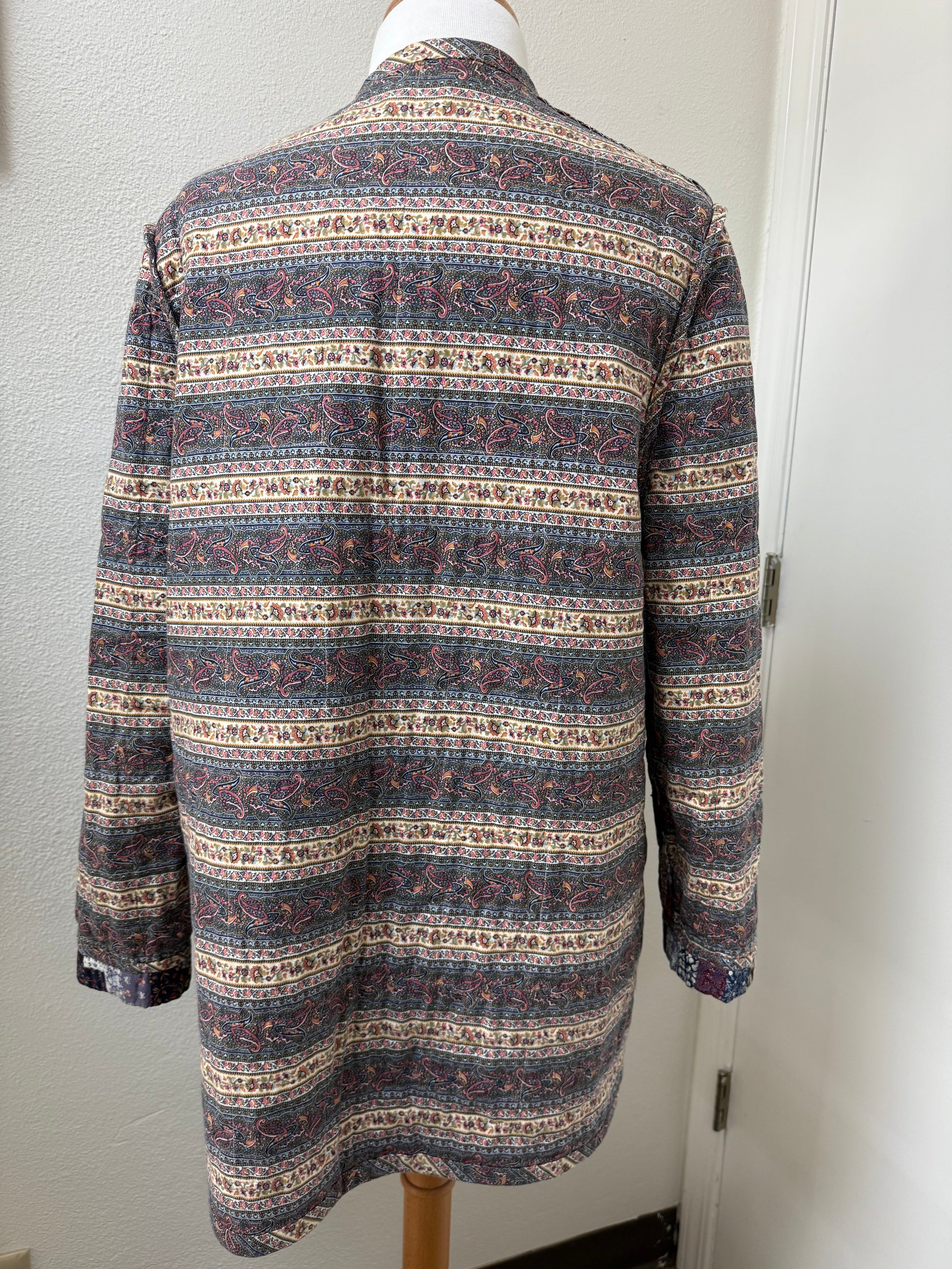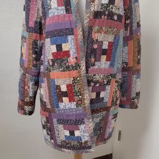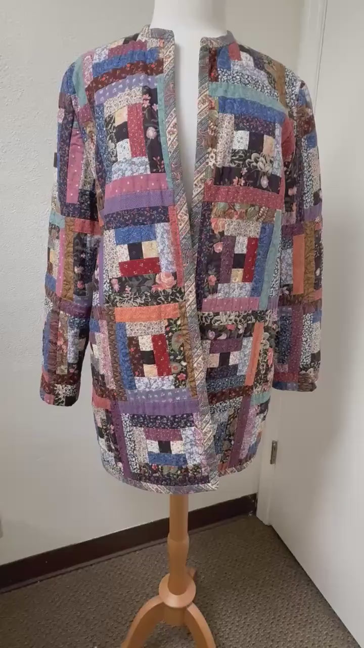 Amazing, handmade quilted jacket. It is free from any rips, tears or stains. It features interior pockets and an open front without buttons. The work is so beautifully done, one might even choose to wear it inside out. Unfortunately, it does not have any tags to identify who or when it was made. We would say it fits a size medium to large, but please look at the following measurements to confirm it will fit before purchasing.