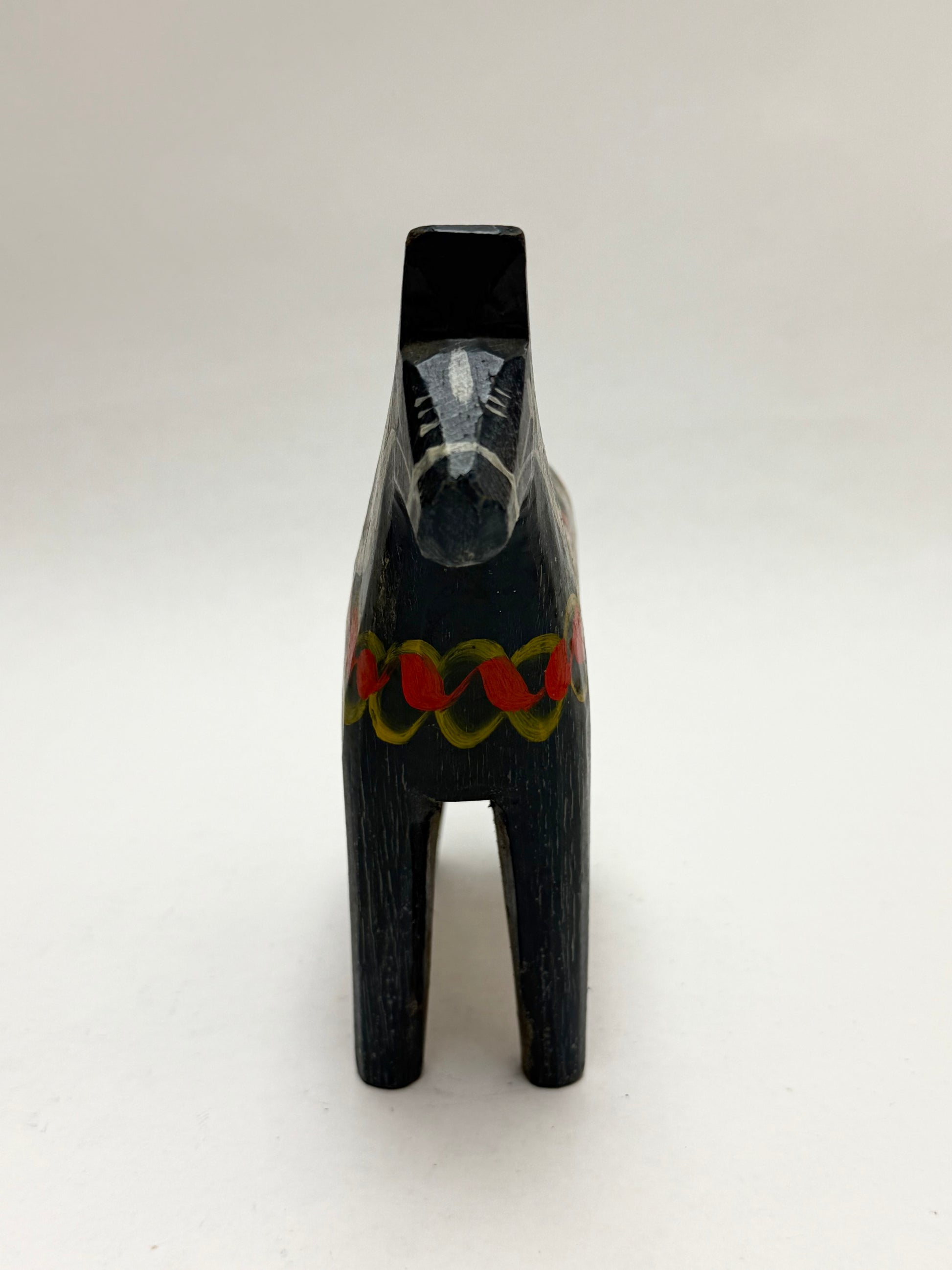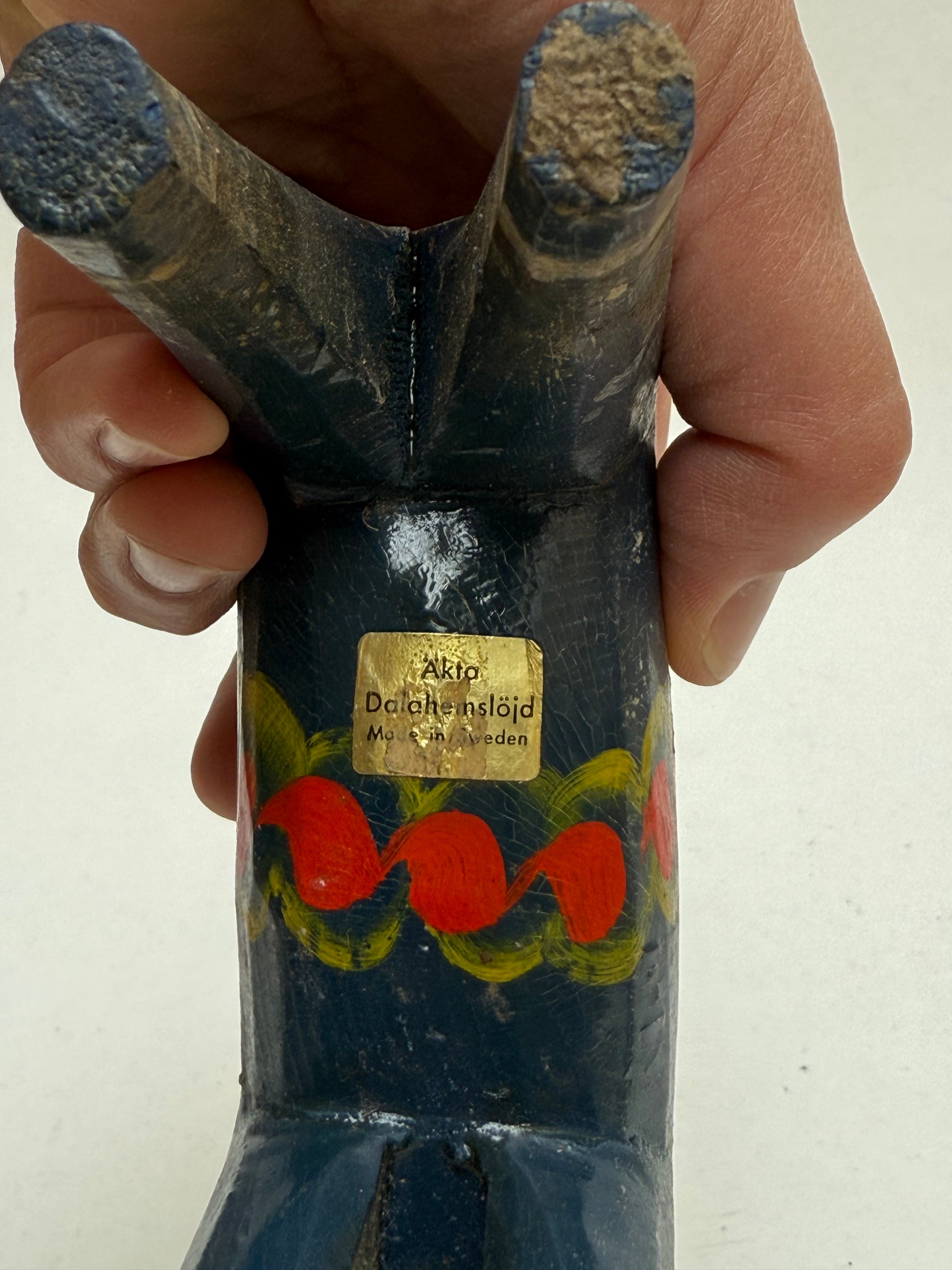 Blue Dala horse that measures 6" tall to the top of the ears, and 6" long. This horse is not perfect, but that is what makes it imperfectly perfect. Please review the pictures and video provided, to see all of imperfections. The sticker on the bottom reads "Akta Dalaheinslojd" and "Made in Sweden". Please let us know if you have any additional questions prior to purchasing.