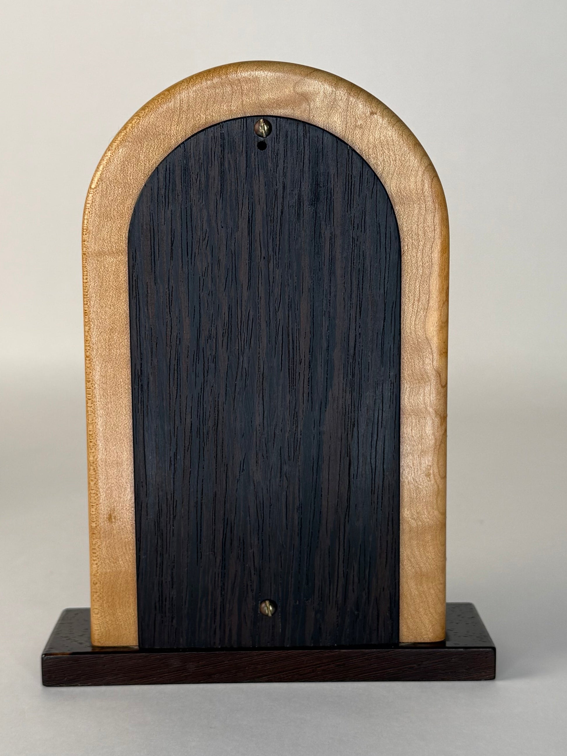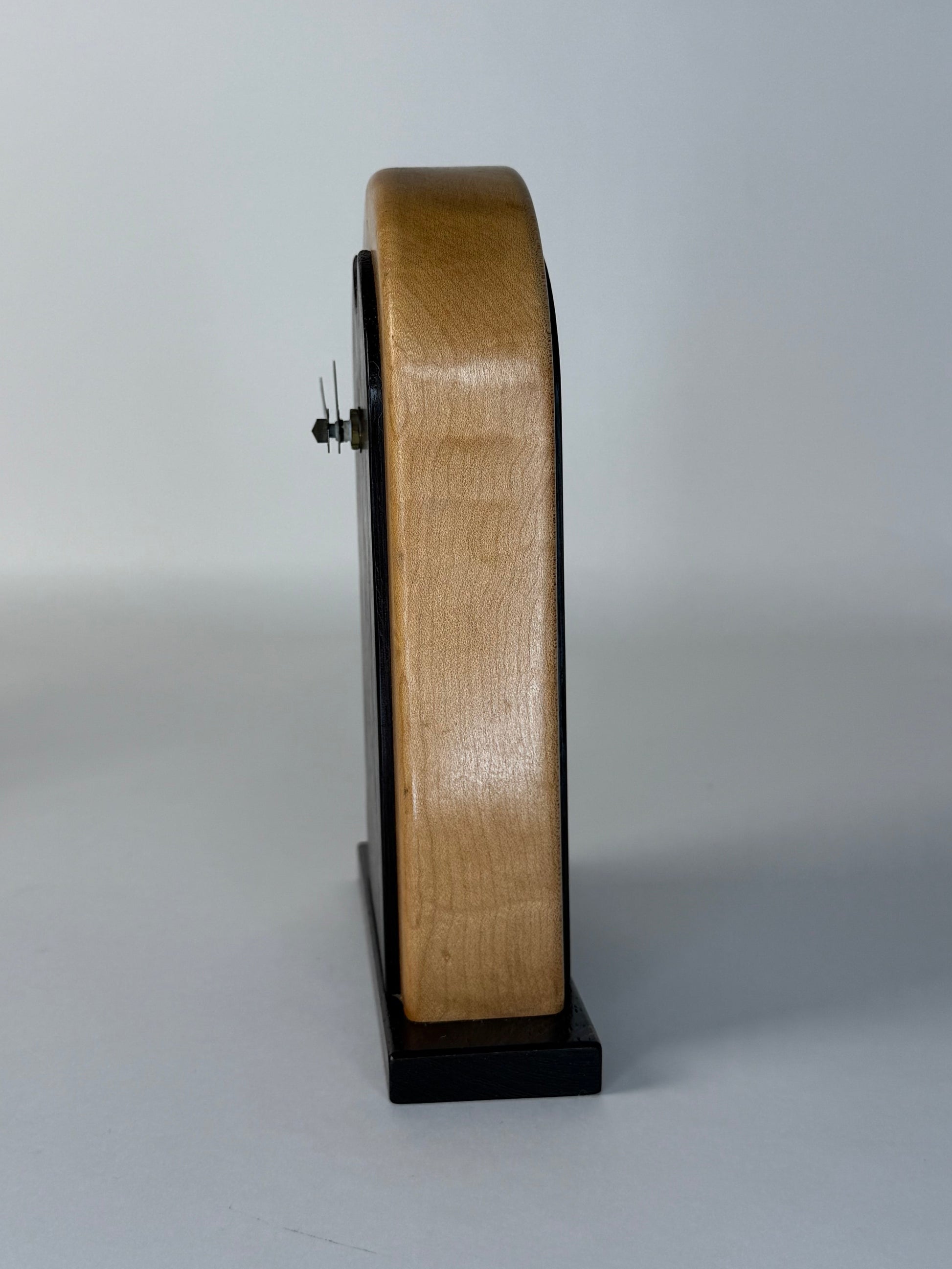 Unique handmade, two toned, mantel clock. The timeless design will bring warmth to any shelf. Please note, it has been tested but will be shipped without a battery. This will prevent it from continuing to run while in transit. The overall dimensions are 8 1/4" T x 6" W x 1 3/4" D.