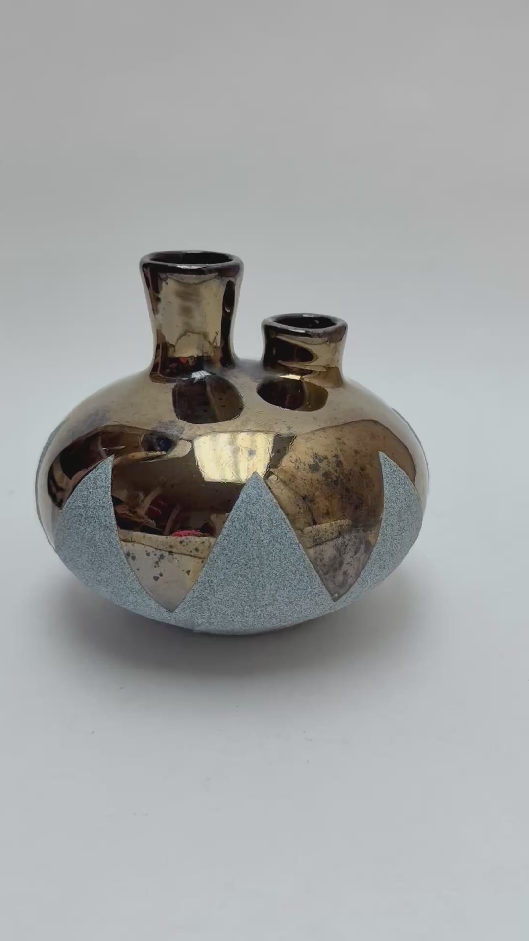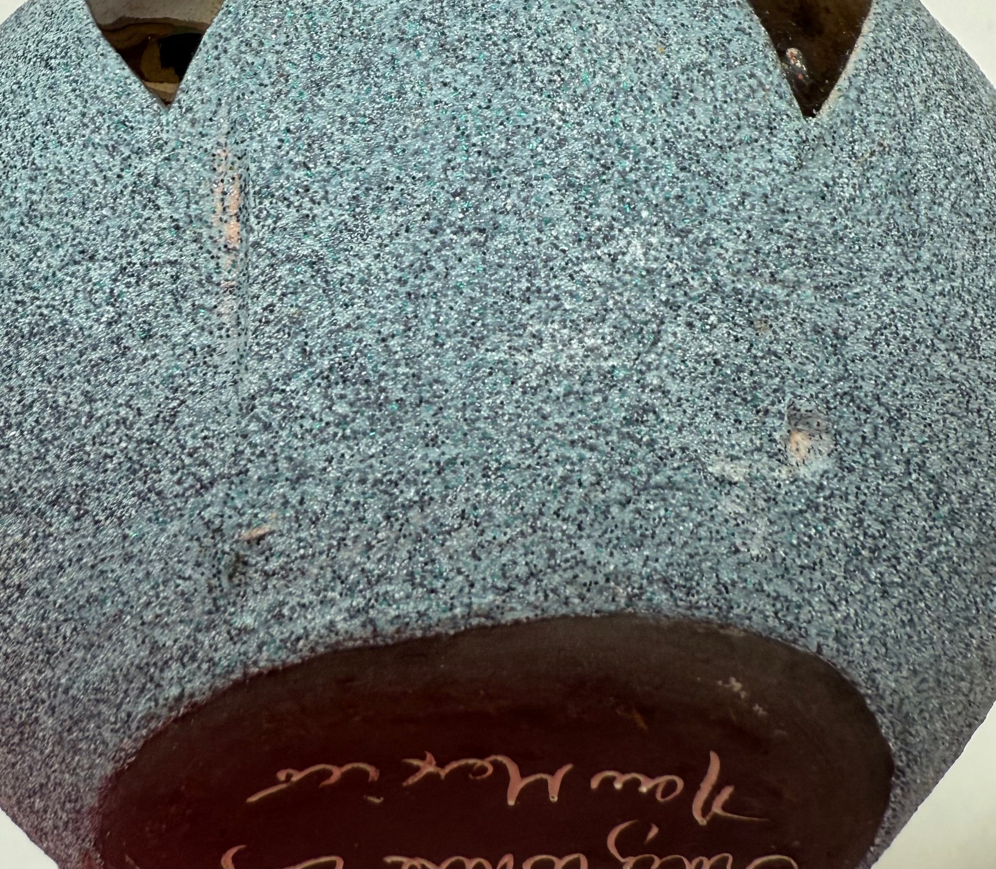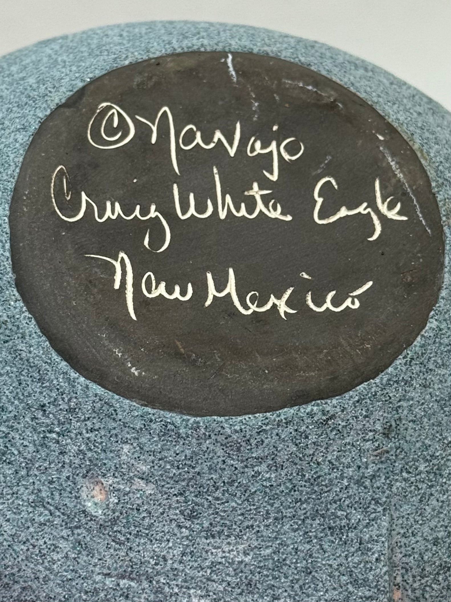 Beautiful metallic brown with textured grey finish vase by New Mexico Navajo artist Craig White Eagle. It is free from any cracks or chip but does have some ware marks that can be seen in the pictures provided. The brown metallic glaze is hard to photograph, but it does have some spotting or discoloration. It measures approximately 6" tall and 5 1/2" wide. Please let us know if you have any additional questions prior to purchasing.