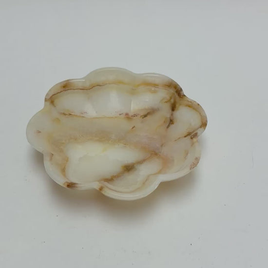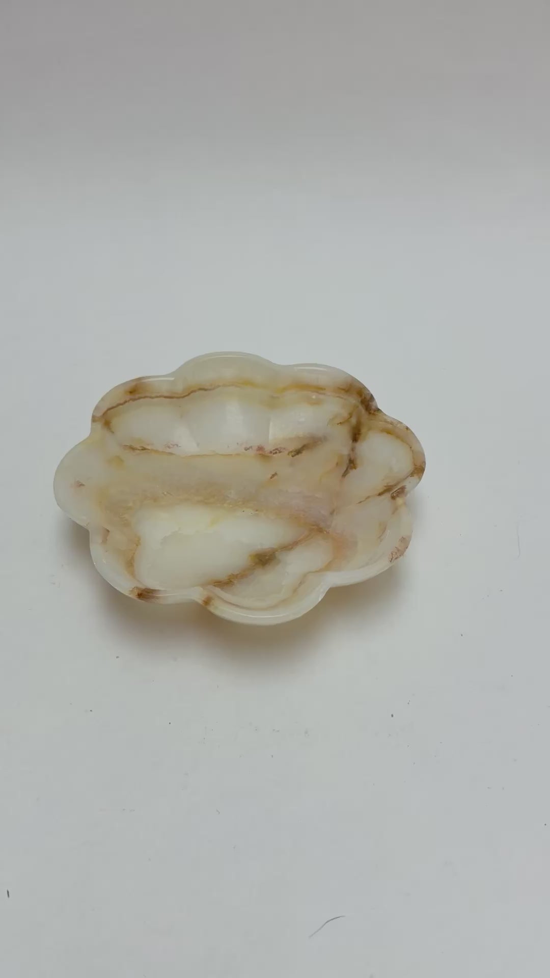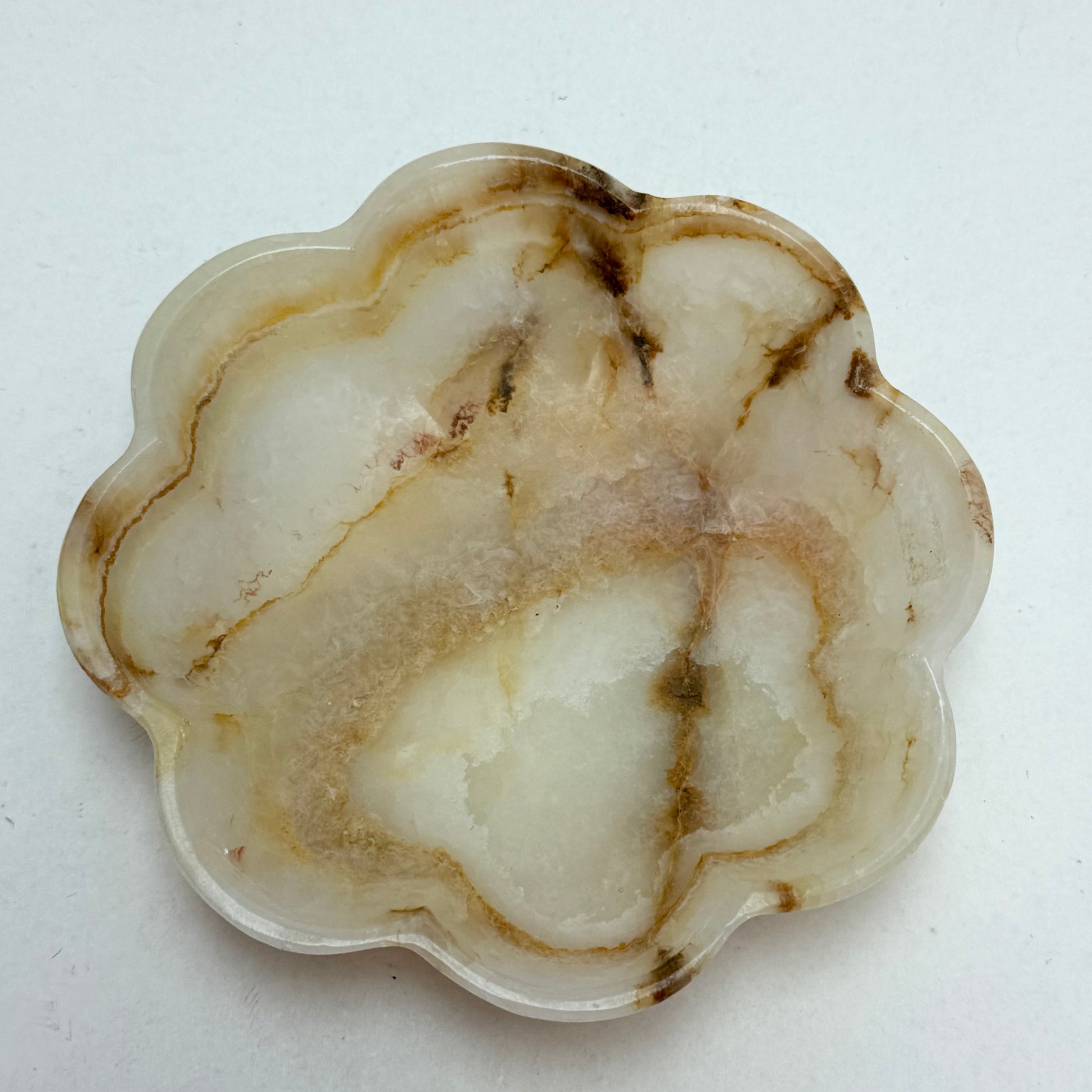 Cute, scalloped Onyx trinket dish. This dish is free from any chips or cracks. It measures approximately 5 1/2" wide and 1" tall. The veining on the dish is beautiful. Please let us know if you have any additional questions prior to purchasing.