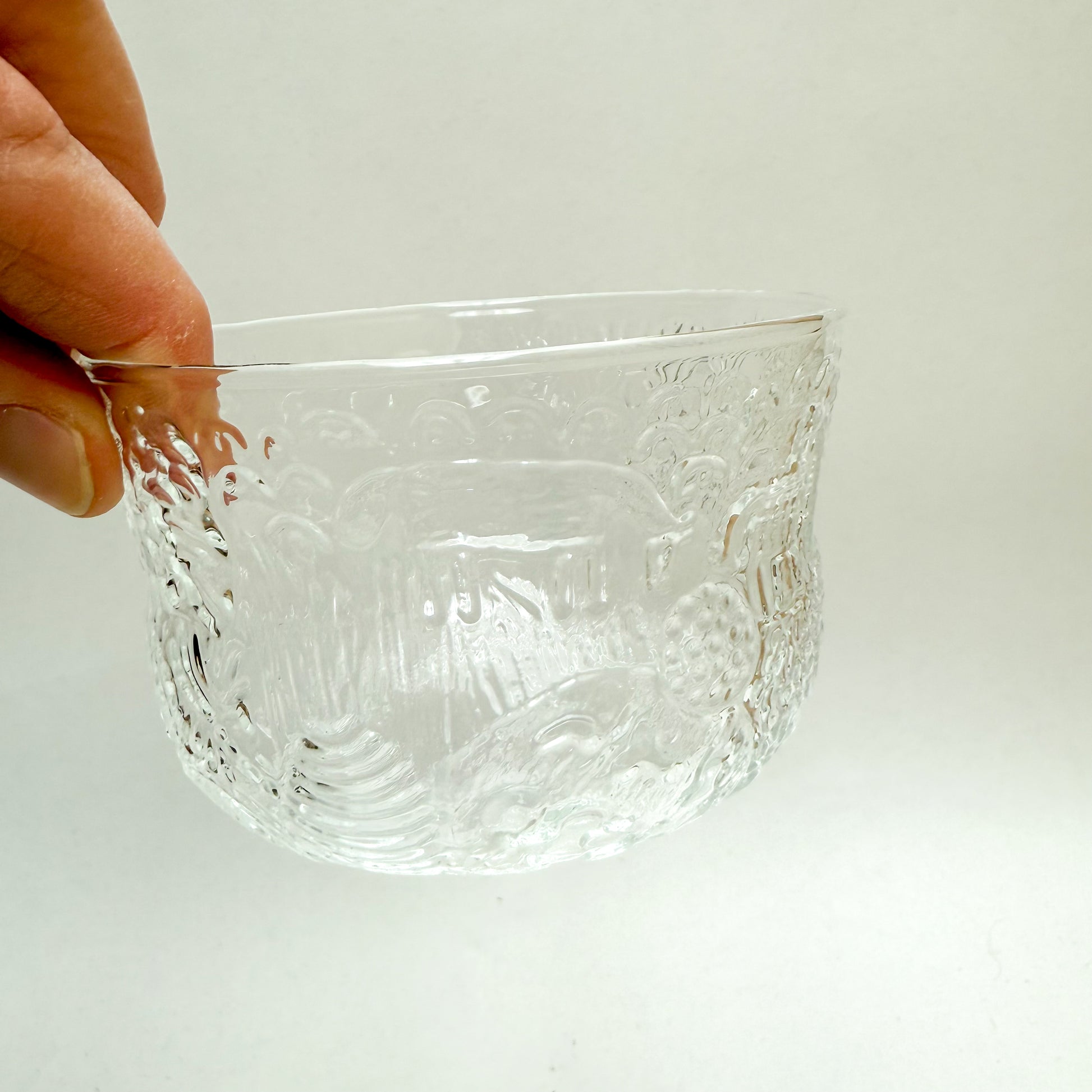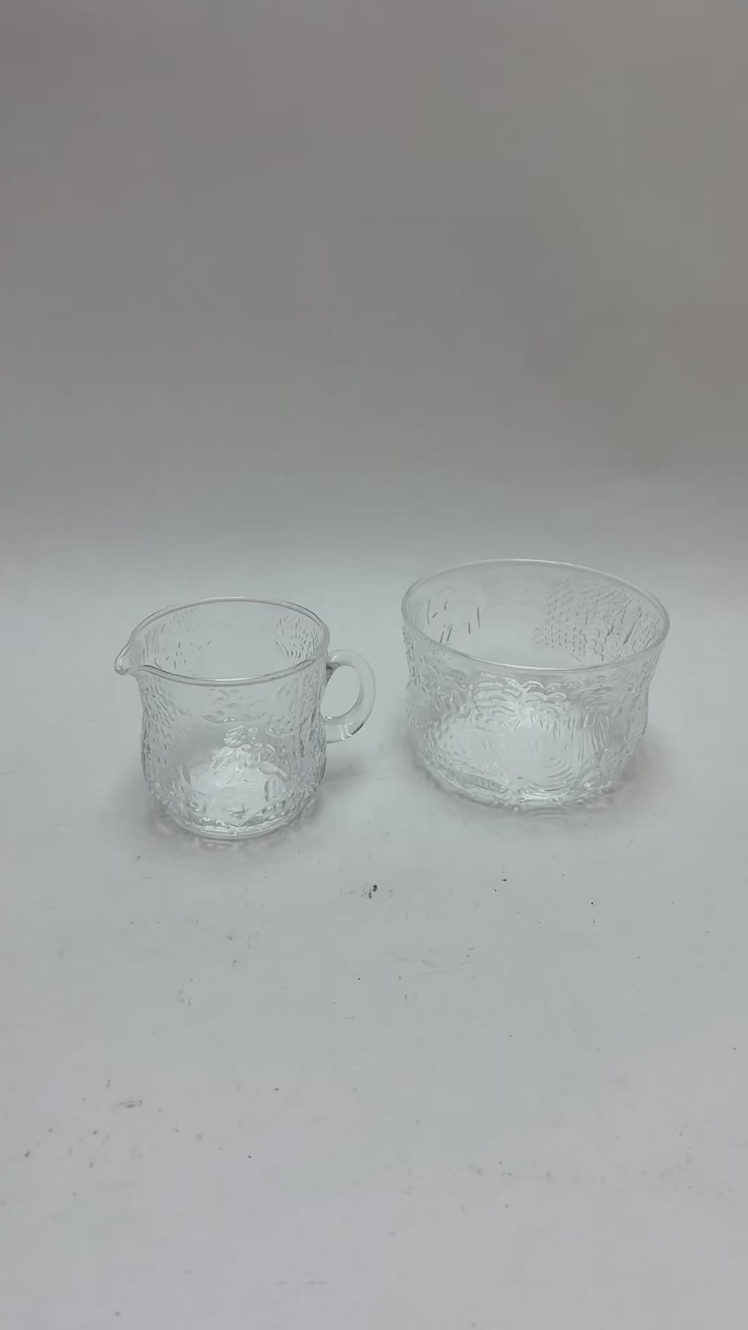 Fun vintage cream and sugar set manufactured by Nuutajarvia of Finland, likely in the 1970s. Crafted with the distinctive Fauna pattern by legendary designer Oiva Toikka, it's a delightful duo that brings Nordic elegance to your table. Perfect for coffee lovers, collectors, or anyone who appreciates mid-century modern aesthetics, this set adds a playful pop of personality to your kitchen or dining room. A timeless treasure that whispers stories of Finnish craftsmanship and design innovation. The sugar bowl measures 3 1/2" W x 2 1/4" T, and creamer measures 2 1/2" T x 2 1/2" W.