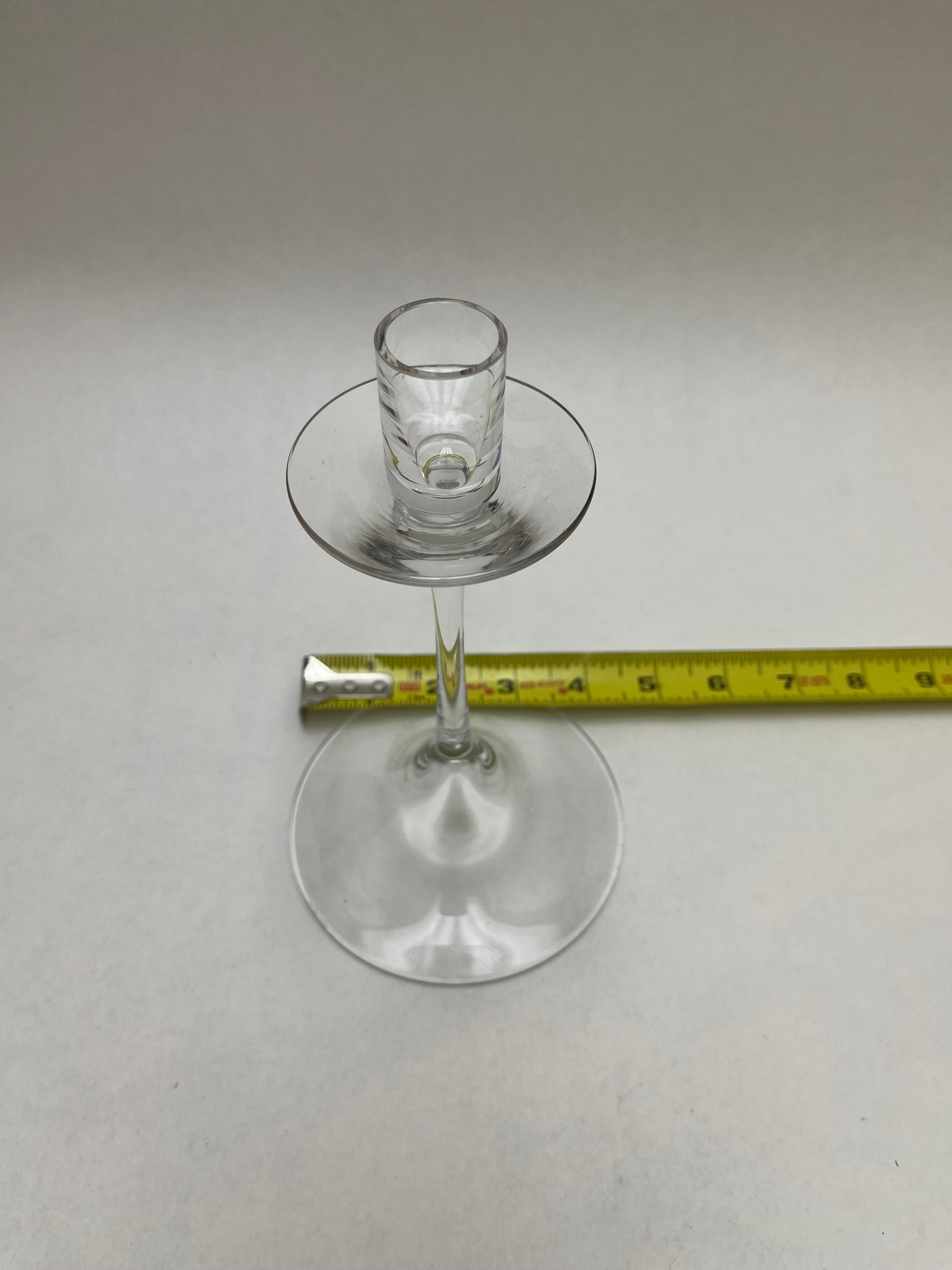 Beautiful pair of "Gabriel" style crystal candle holders by Orrefors. The candle holders are in great vintage condition. The base measures approximately 4 1/4" wide and 7 1/2" tall. The blue candles shown in one of the images are not included. They are only used to give you an idea as to what they look like with candles in them. The hole for the candle's measures approximately 3/4" wide and fit taper candle with a 3/4" wide base. Please let us know if you have any additional questions before purchasing.