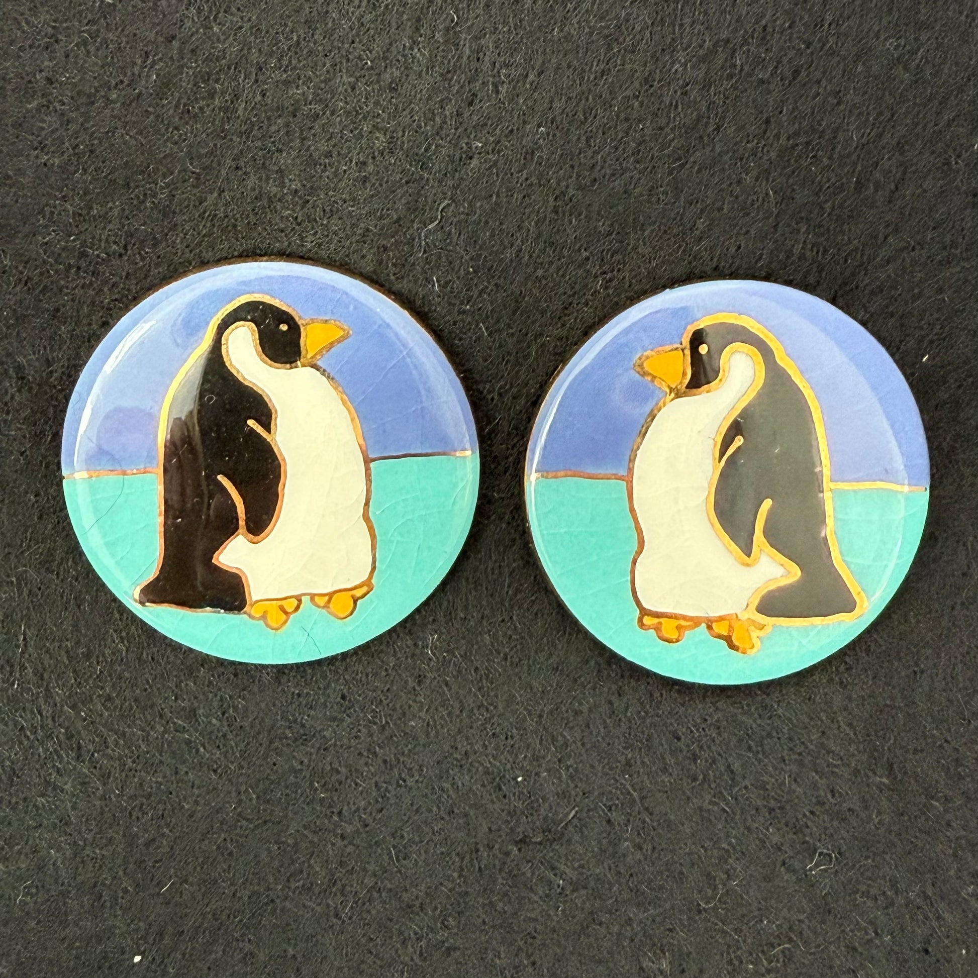 Adorable pair of vintage painted ceramic Penguin post earrings. We have been unable to identify the maker of these earrings, but believe they are from the 1980s. They measure approximately 1 1/2" long by 1 1/2" wide. Please let us know if you have any questions before purchasing.